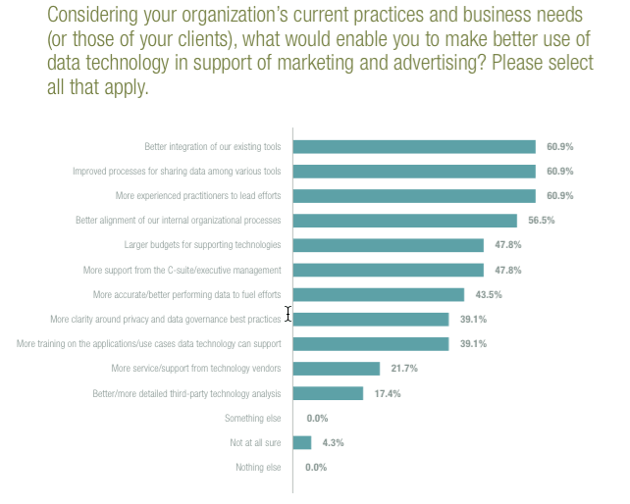 - Silos of data scattered across the organization. According to a survey done by Hubspot, marketers on average use now approximately 31 dedicated tools. Those tools aren’t exactly unified, since 60.9% of those marketers surveyed claim that better integration of existing tools and improved data sharing among them would help them make better use of their data technology: