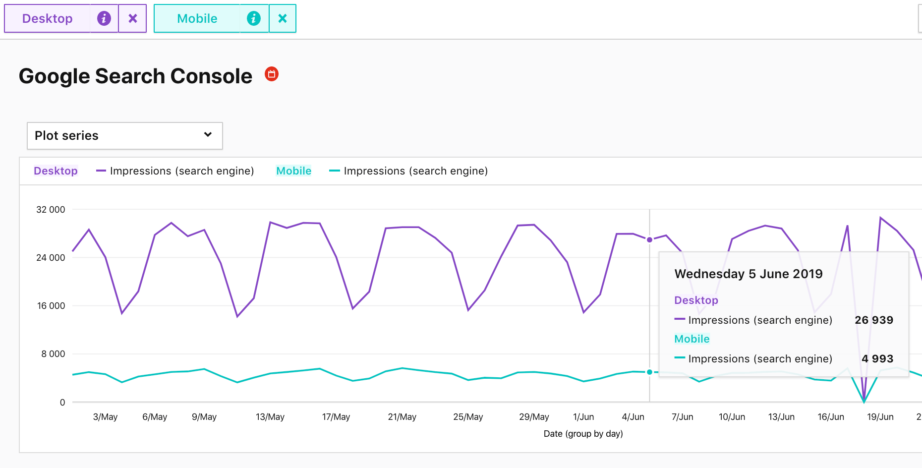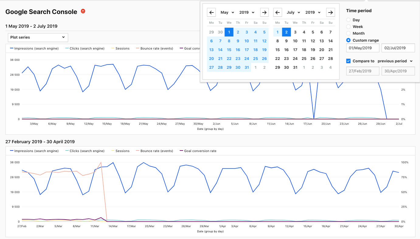 What’s more, you can change the period for which data is grouped on each chart. This is crucial in discovering seasonality and spotting trends across extended time frames like weeks, months, quarters or years.