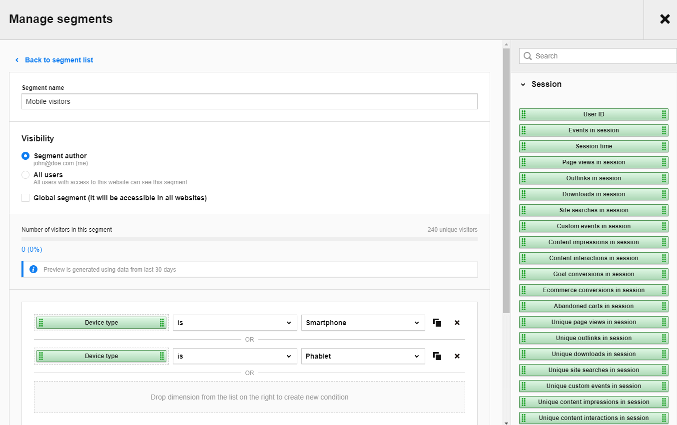 What’s more, you can directly compare segments from each report in Piwik PRO. For instance, you can simultaneously apply a segment for mobile users and a segment for desktop users.
