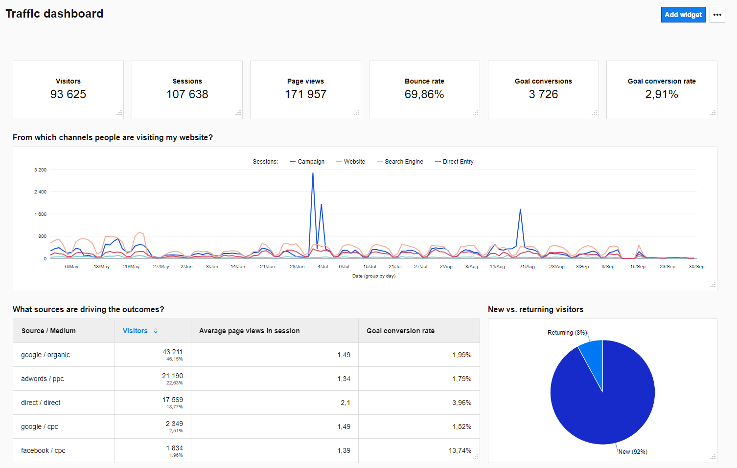 The new Piwik PRO makes grasping the story your data is telling about your business effortless. We’re talking about dashboards, collections of widgets to visualize data. They provide an overview of your business analytics metrics, KPIs, and important data points, all presented on one screen.